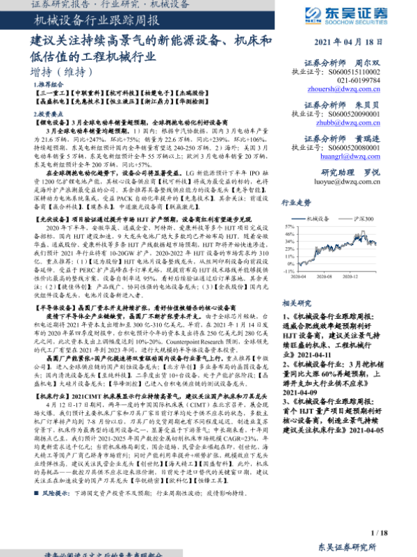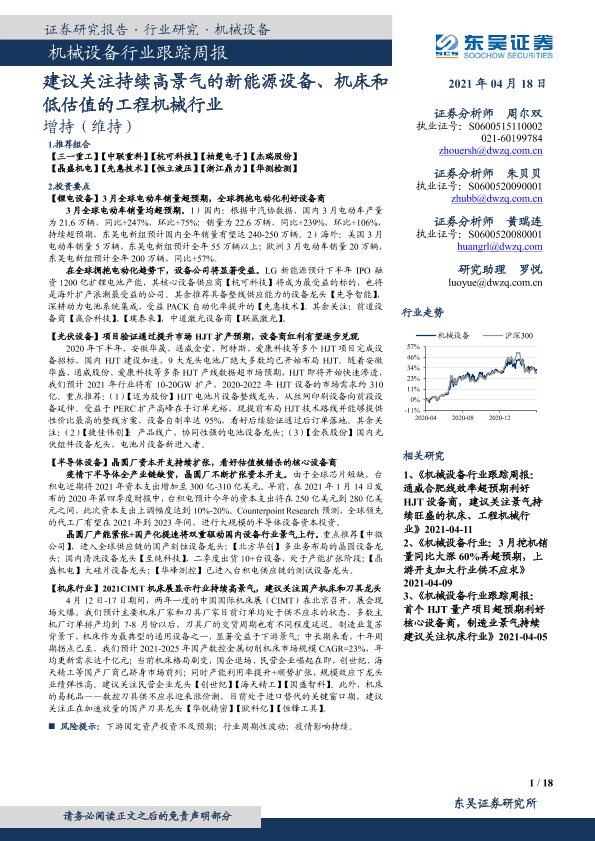 【东吴证券】【20210418】机械设备行业跟踪周报:建议关注持续高景气的新能源设备、机床和低估值的工程机械行业-18页