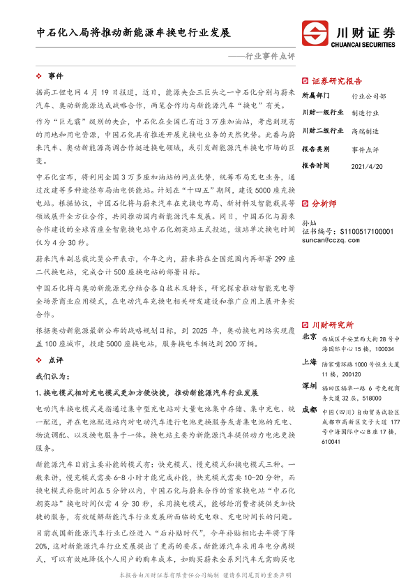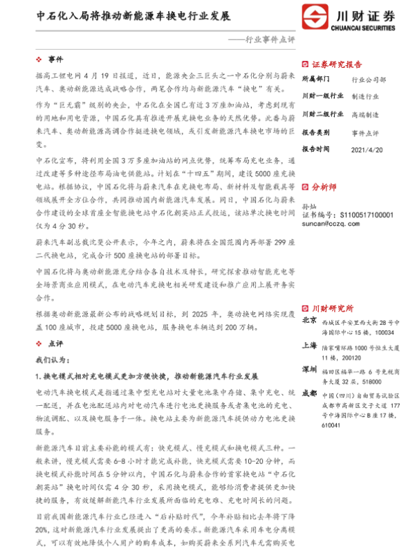 【川财证券】【20210420】高端制造行业事件点评:中石化入局将推动新能源车换电行业发展-3页
