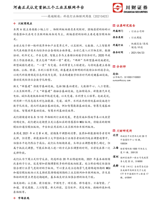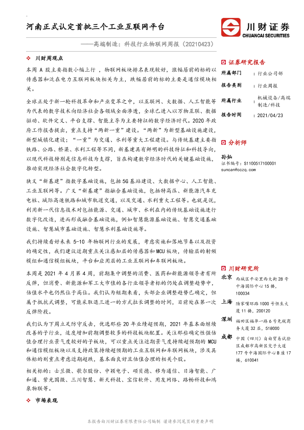 【川财证券】【20210423】高端制造:科技行业物联网周报:河南正式认定首批三个工业互联网平台-20页