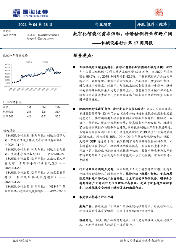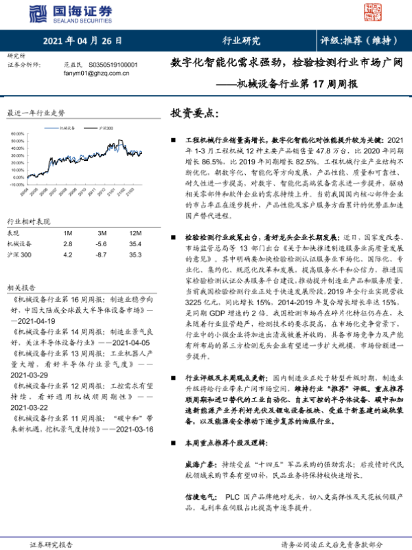 【国海证券】【20210426】20210426-国海证券-机械设备行业第17周周报:数字化智能化需求强劲,检验检测行业市场广阔-19页