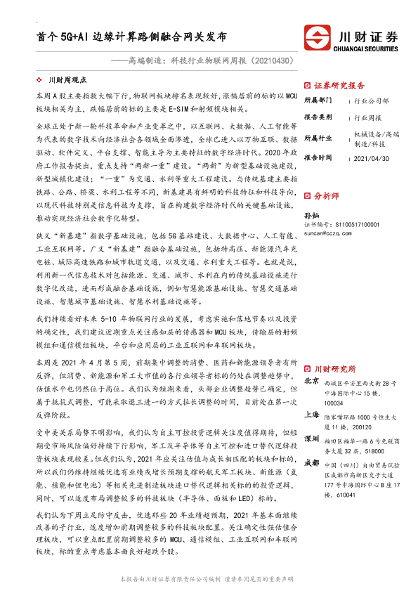 【川财证券】【20210430】高端制造:科技行业物联网周报:首个5G+AI边缘计算路侧融合网关发布-21页