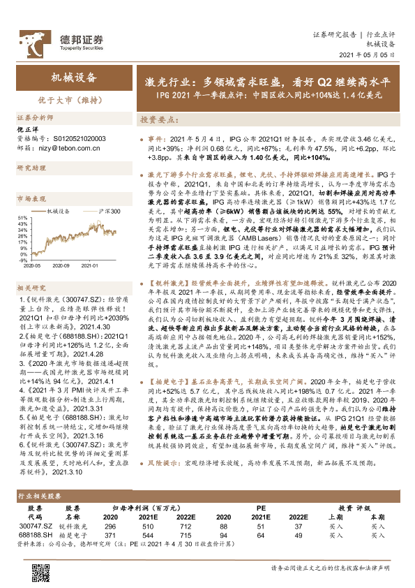 【德邦证券】【20210505】20210505-德邦证券-激光行业:IPG2021年一季报点评:中国区收入同比+104%达1.4亿美元,激光行业:多领域需求旺盛,看好Q2继续高水平-2页