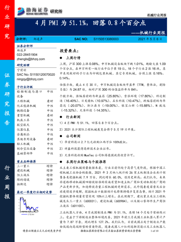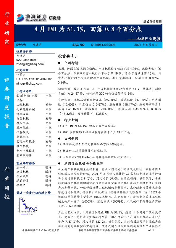 【渤海证券】【20210506】20210506-渤海证券-机械行业周报:4月PMI为51.1%,回落0.8个百分点-10页