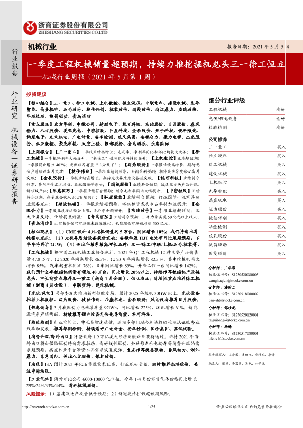 【浙商证券】【20210505】机械行业周报(2021年5月第1周):一季度工程机械销量超预期,持续力推挖掘机龙头三一徐工恒立-25页