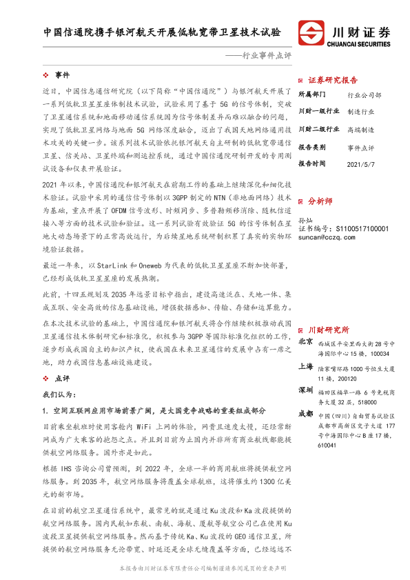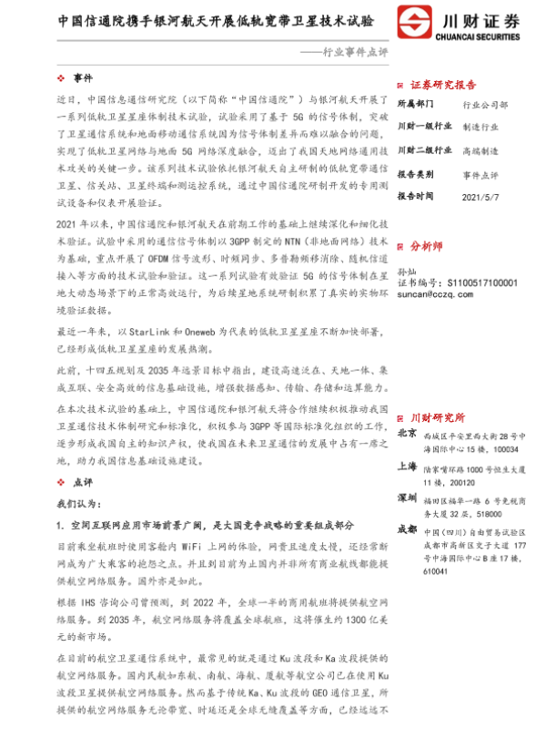 【川财证券】【20210507】高端制造行业事件点评:中国信通院携手银河航天开展低轨宽带卫星技术试验-3页