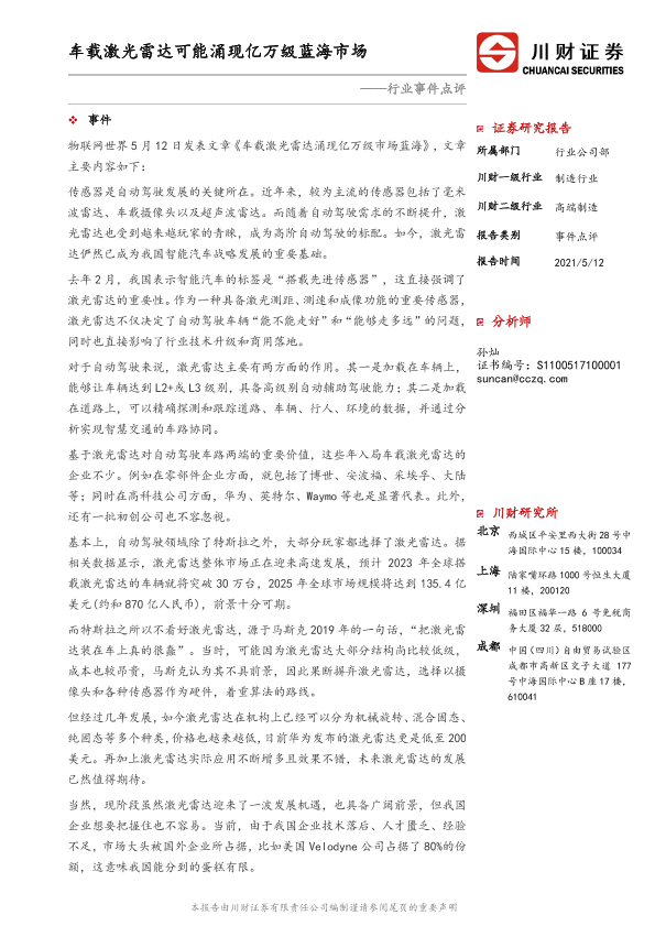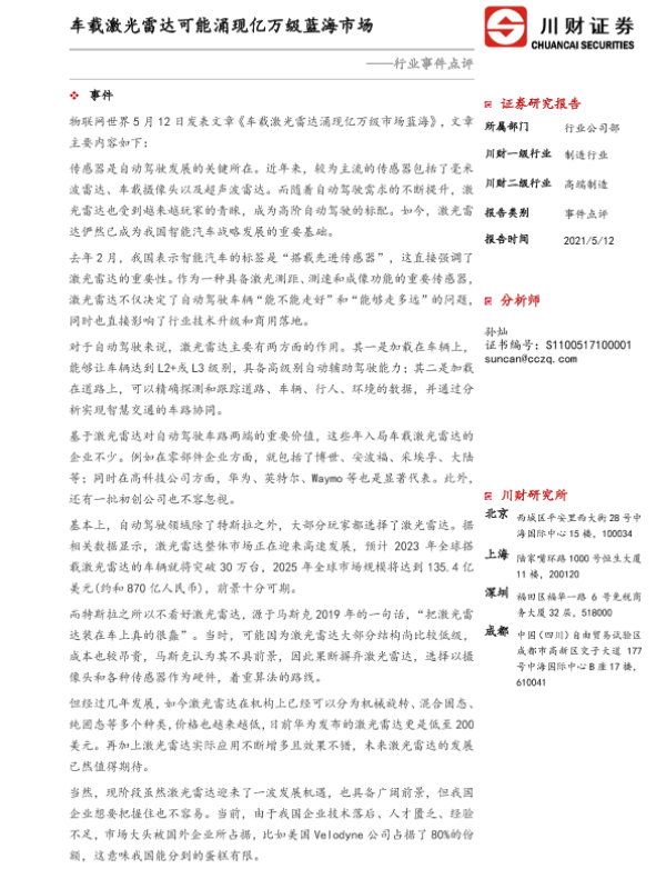 【川财证券】【20210512】高端制造行业事件点评:车载激光雷达可能涌现亿万级蓝海市场-4页