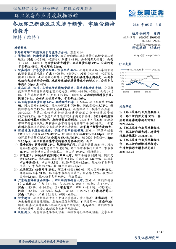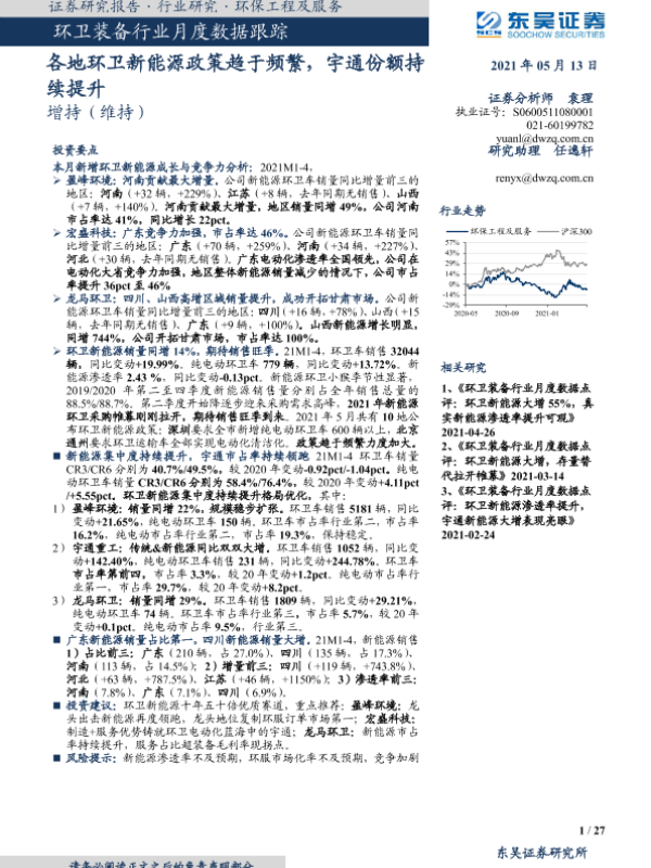 【东吴证券】【20210513】环卫装备行业月度数据跟踪:各地环卫新能源政策趋于频繁,宇通份额持续提升-27页