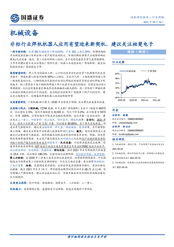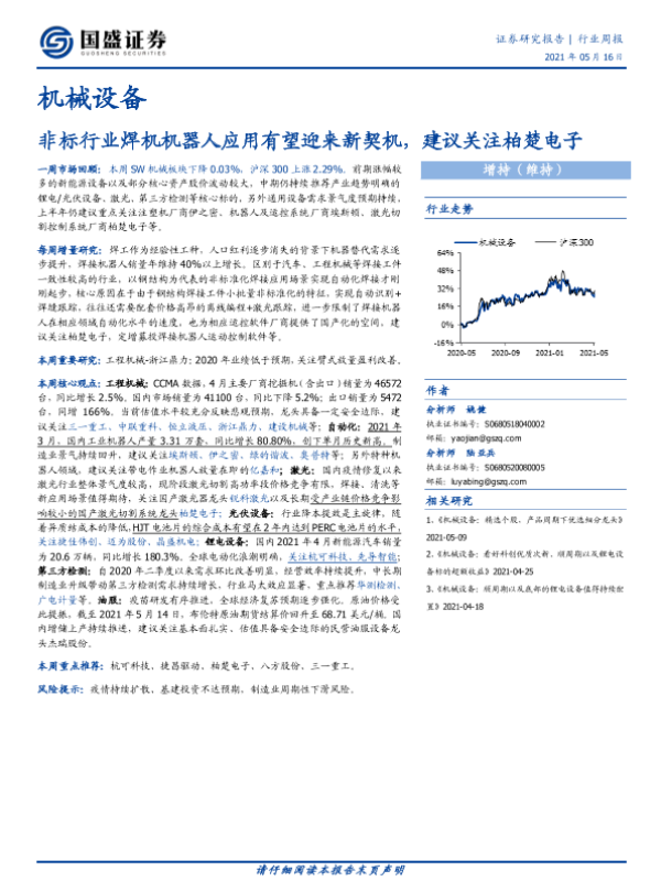 【国盛证券】【20210516】20210516-国盛证券-机械设备行业周报:非标行业焊机机器人应用有望迎来新契机,建议关注柏楚电子-12页