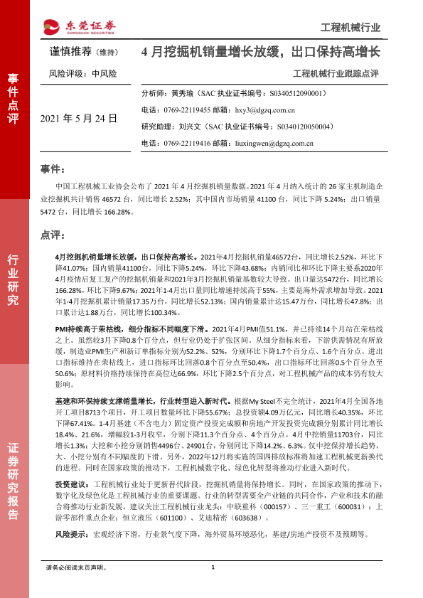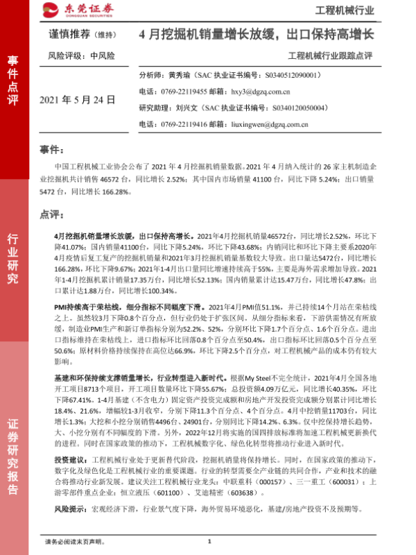 【东莞证券】【20210524】20210524-东莞证券-工程机械行业跟踪点评:4月挖掘机销量增长放缓,出口保持高增长-3页