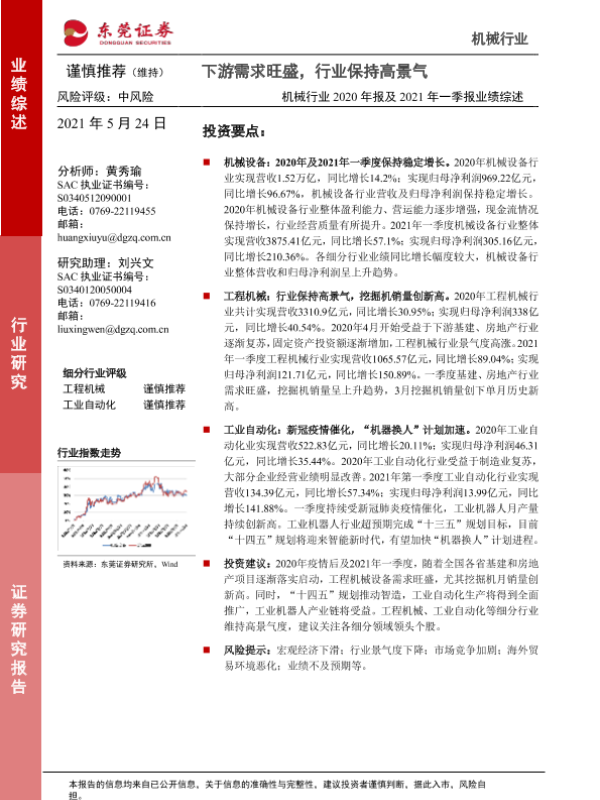 【东莞证券】【20210524】机械行业2020年报及2021年一季报业绩综述:下游需求旺盛,行业保持高景气-13页