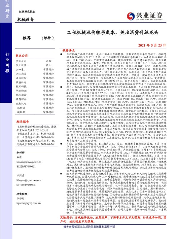 【兴业证券】【20210523】20210523-兴业证券-机械设备行业周报:工程机械涨价转移成本,关注消费升级龙头-21页