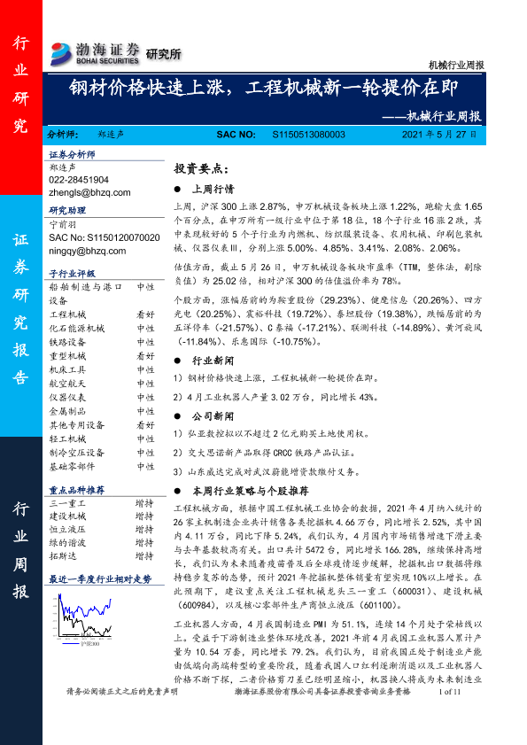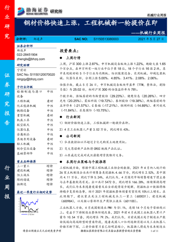 【渤海证券】【20210527】20210527-渤海证券-机械行业周报:钢材价格快速上涨,工程机械新一轮提价在即-11页