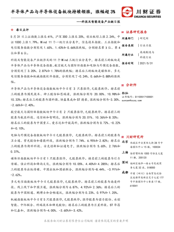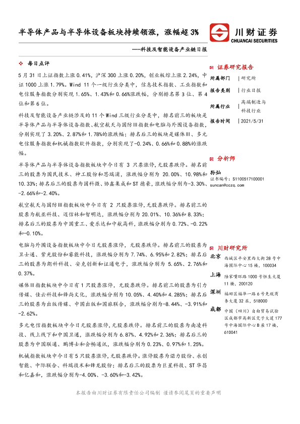【川财证券】【20210531】科技及智能设备产业链日报:半导体产品与半导体设备板块持续领涨,涨幅超3%-4页