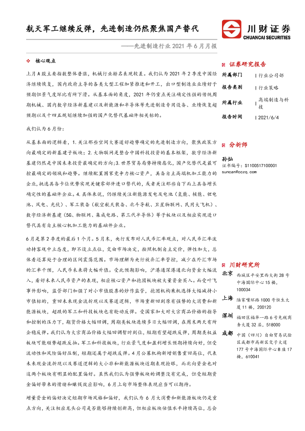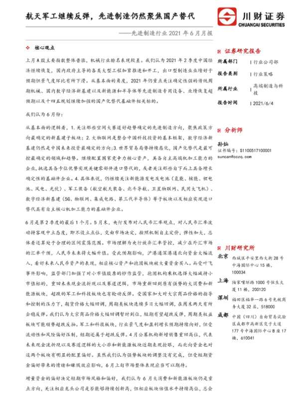 【川财证券】【20210604】先进制造行业2021年6月月报:航天军工继续反弹,先进制造仍然聚焦国产替代-20页