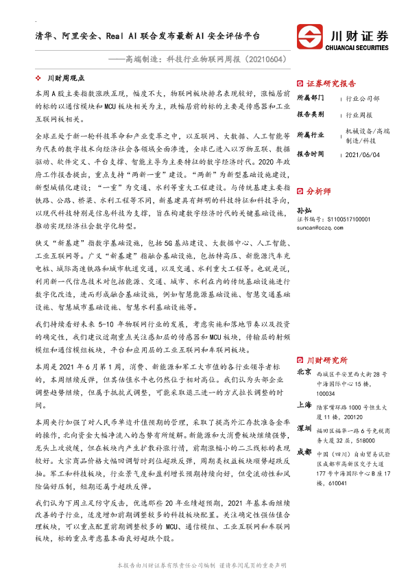 【川财证券】【20210604】高端制造:科技行业物联网周报:清华、阿里安全、Real AI联合发布最新AI安全评估平台-21页