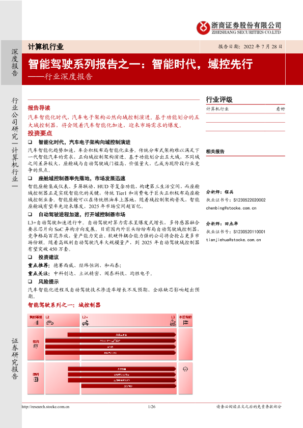 【浙商证券】【20220728】计算机行业深度报告:智能驾驶系列报告之一,智能时代,域控先行-26页