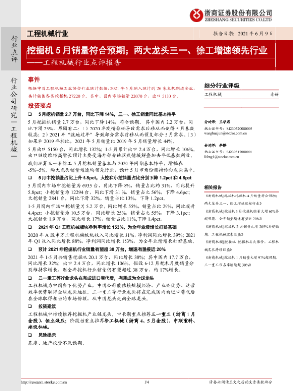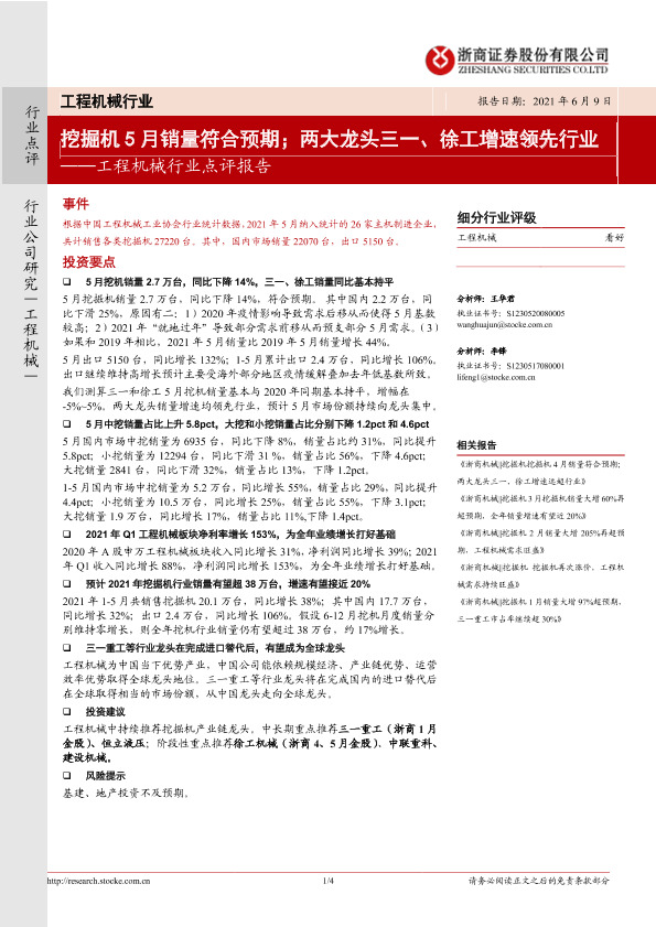 【浙商证券】【20210609】20210609-浙商证券-工程机械行业点评报告:挖掘机5月销量符合预期;两大龙头三一、徐工增速领先行业-4页