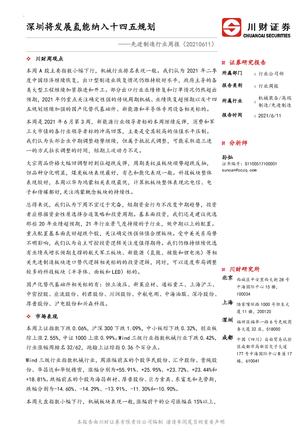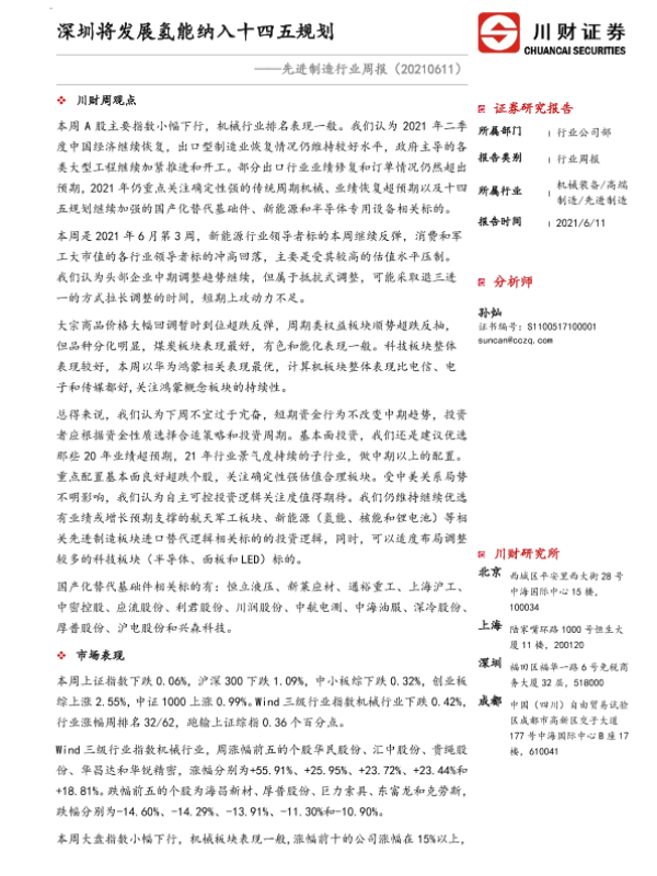 【川财证券】【20210611】20210611-川财证券-先进制造行业周报:深圳将发展氢能纳入十四五规划-15页