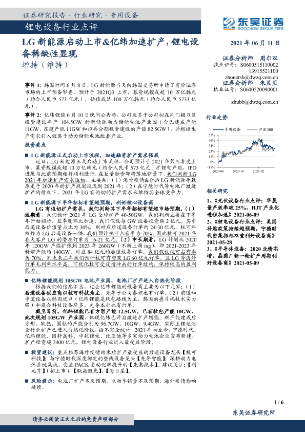【东吴证券】【20210611】锂电设备行业点评:LG新能源启动上市&亿纬加速扩产,锂电设备稀缺性显现-6页