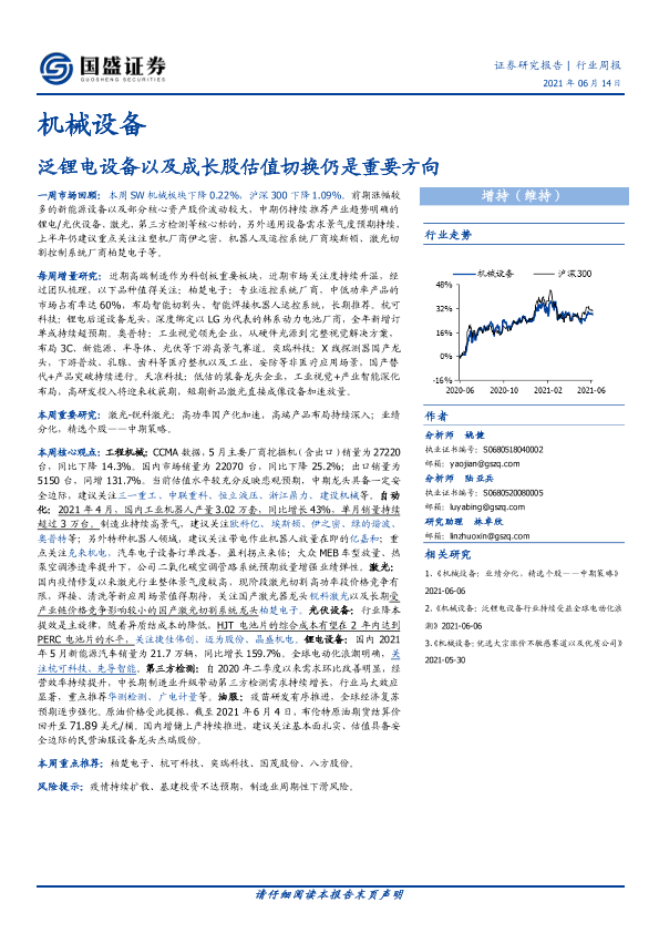 【国盛证券】【20210614】20210614-国盛证券-机械设备行业周报:泛锂电设备以及成长股估值切换仍是重要方向-11页