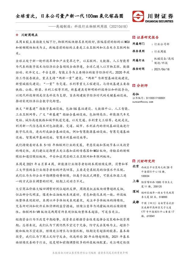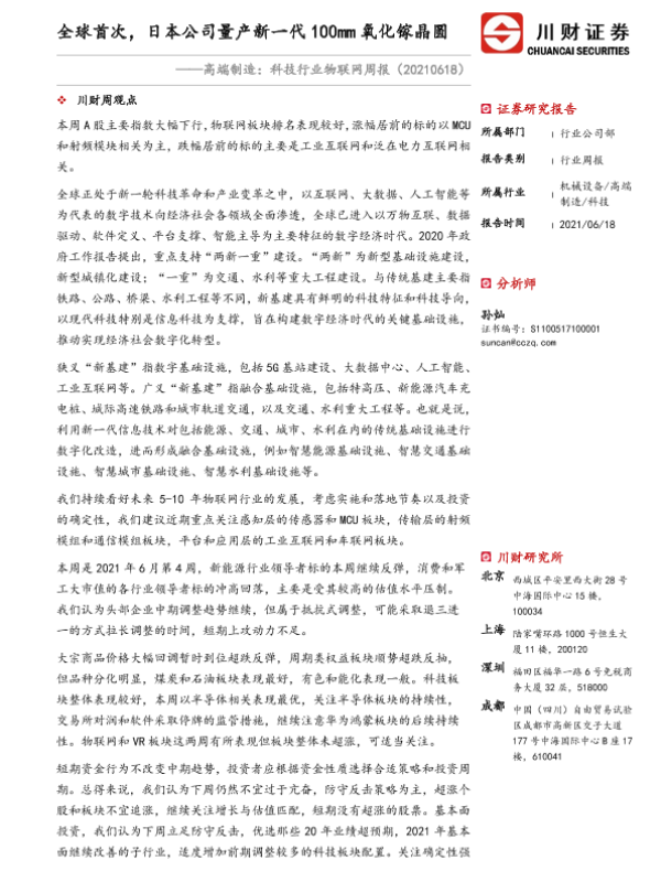 【川财证券】【20210618】高端制造:科技行业物联网周报:全球首次,日本公司量产新一代100mm氧化镓晶圆-20页