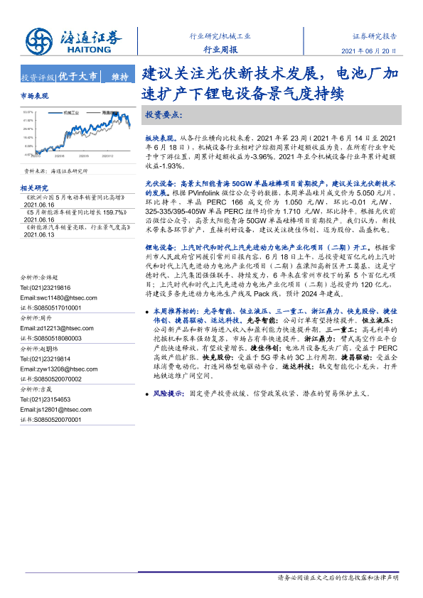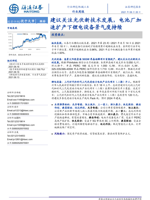 【海通证券】【20210620】机械工业行业周报:建议关注光伏新技术发展,电池厂加速扩产下锂电设备景气度持续-10页