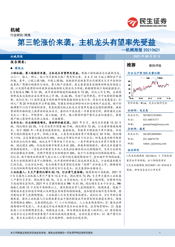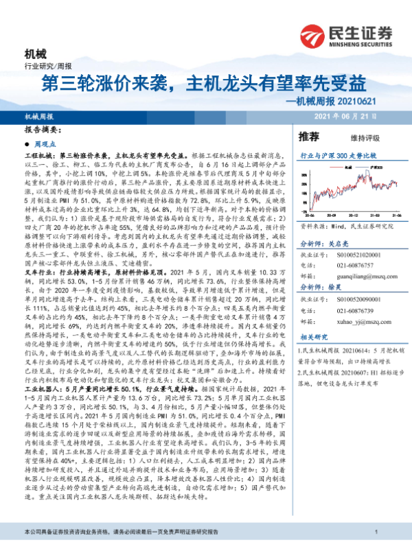 【民生证券】【20210621】20210621-民生证券-机械周报:第三轮涨价来袭,主机龙头有望率先受益-23页