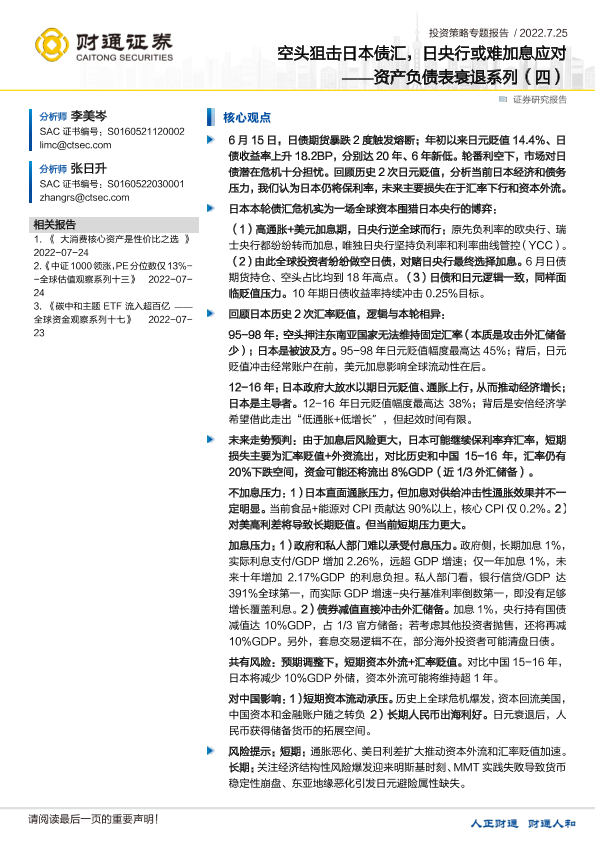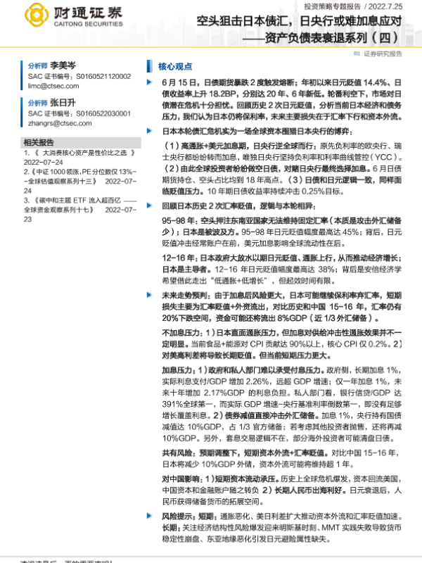 【财通证券】【20220725】资产负债表衰退系列(四):空头狙击日本债汇,日央行或难加息应对-23页