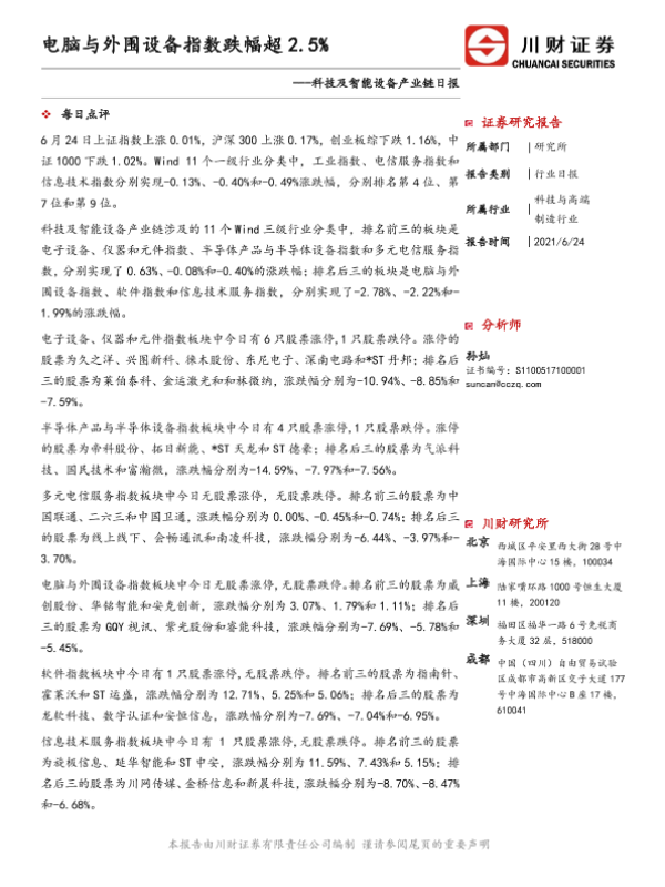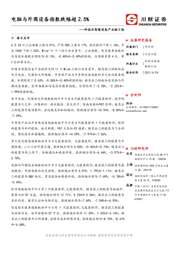 【川财证券】【20210624】20210624-川财证券-科技及智能设备产业链日报:电脑与外围设备指数跌幅超2.5%-8页