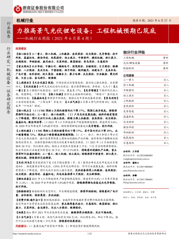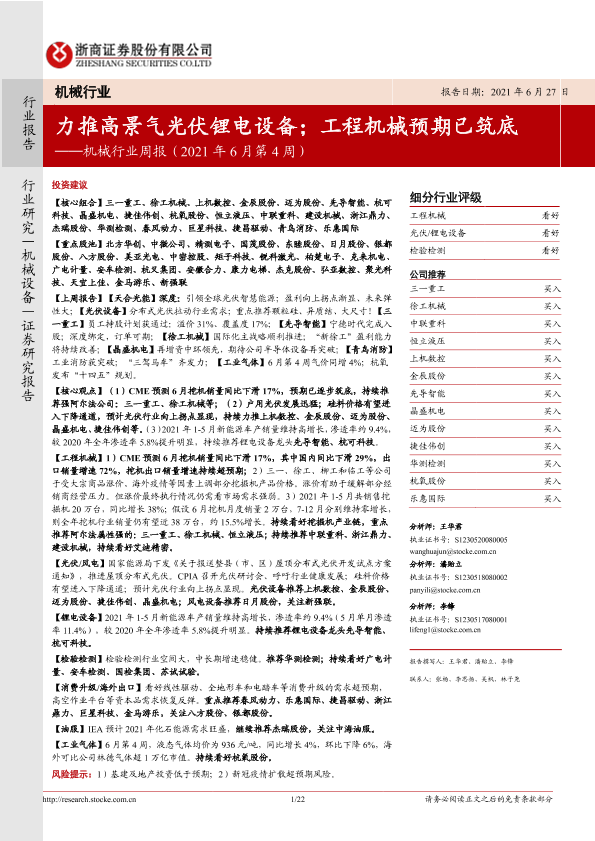 【浙商证券】【20210627】机械行业周报(2021年6月第4周):力推高景气光伏锂电设备;工程机械预期已筑底-22页