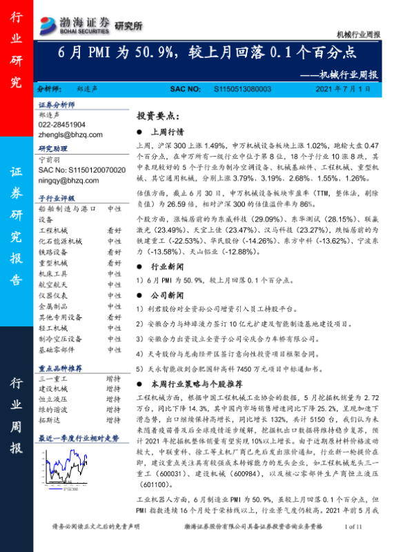 【渤海证券】【20210701】20210701-渤海证券-机械行业周报:6月PMI为50.9%,较上月回落0.1个百分点-11页
