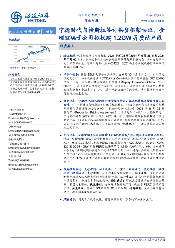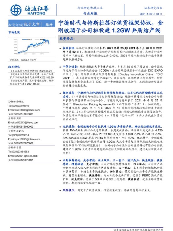 【海通证券】【20210704】20210704-海通证券-机械工业行业周报:宁德时代与特斯拉签订供货框架协议,金刚玻璃子公司拟投建1.2GW异质结产线-10页