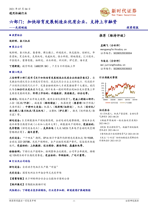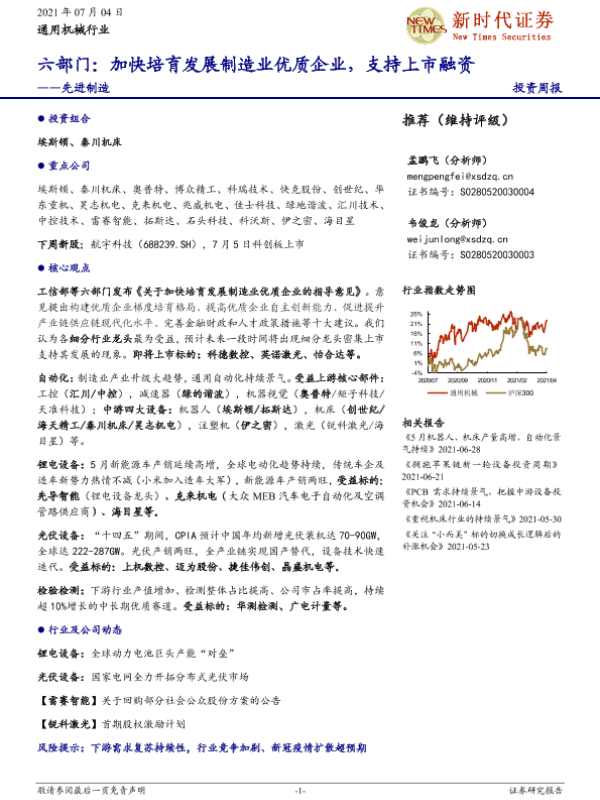 【新时代证券】【20210704】20210704-新时代证券-先进制造投资周报:六部门:加快培育发展制造业优质企业,支持上市融资-15页
