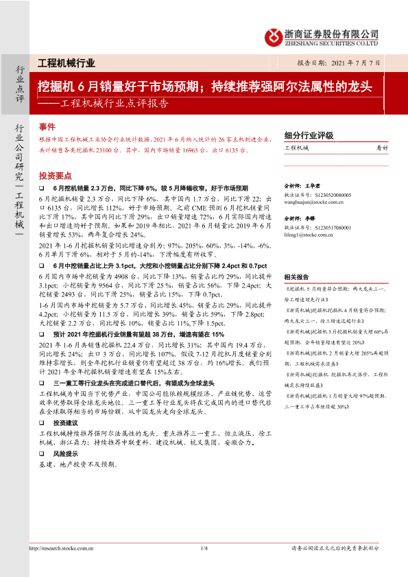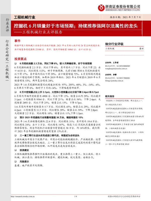 【浙商证券】【20210707】20210707-浙商证券-工程机械行业点评报告:挖掘机6月销量好于市场预期;持续推荐强阿尔法属性的龙头-4页