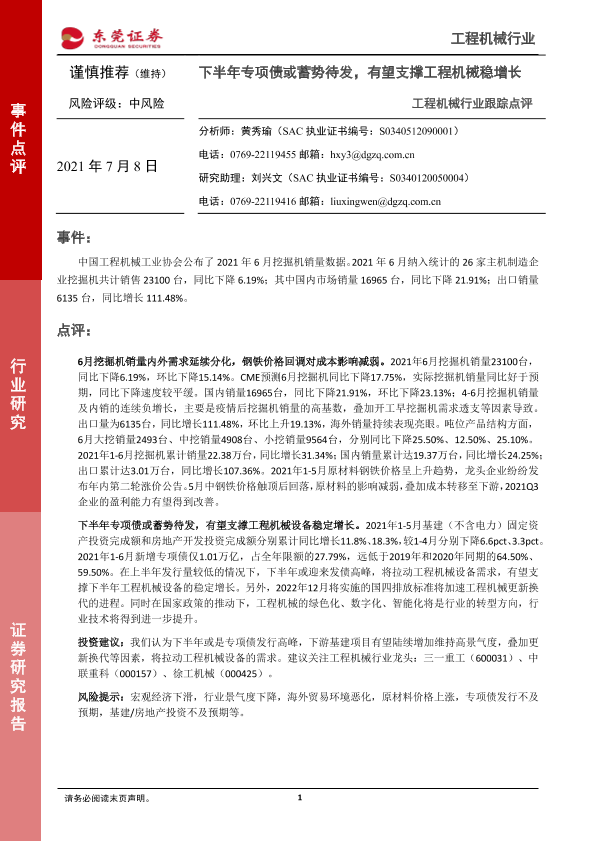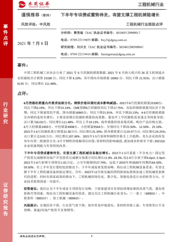 【东莞证券】【20210708】工程机械行业跟踪点评:下半年专项债或蓄势待发,有望支撑工程机械稳增长-3页