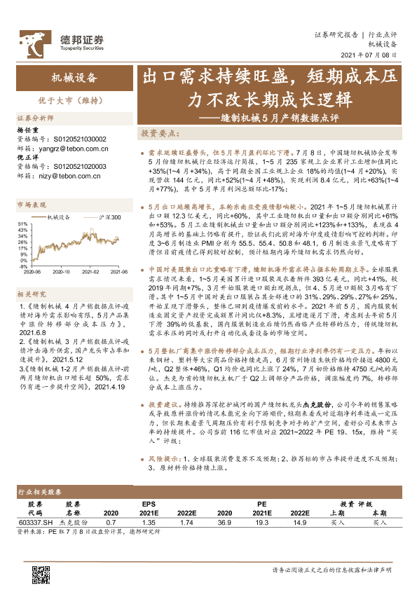 【德邦证券】【20210708】缝制机械5月产销数据点评:出口需求持续旺盛,短期成本压力不改长期成长逻辑-3页