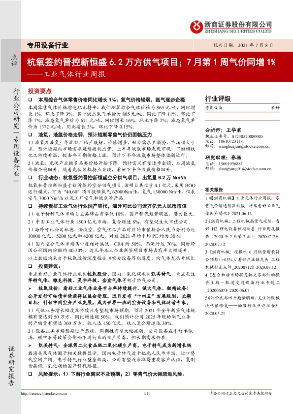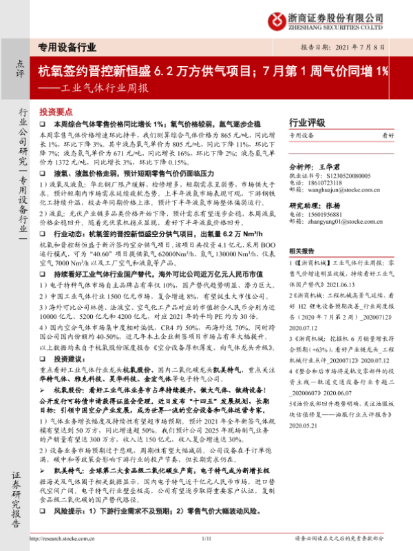 【浙商证券】【20210708】20210708-浙商证券-工业气体行业周报:杭氧签约晋控新恒盛6.2万方供气项目;7月第1周气价同增1%-11页