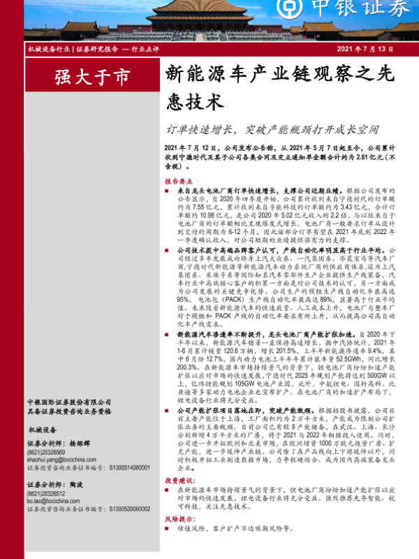 【中银证券】【20210713】机械设备行业:新能源车产业链观察之先惠技术-订单快速增长,突破产能瓶颈打开成长空间-4页