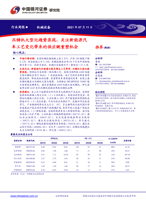 【银河证券】【20210711】20210711-中国银河-机械设备行业周报:压铸机大型化趋势显现,关注新能源汽车工艺变化带来的供应链重塑机会-12页