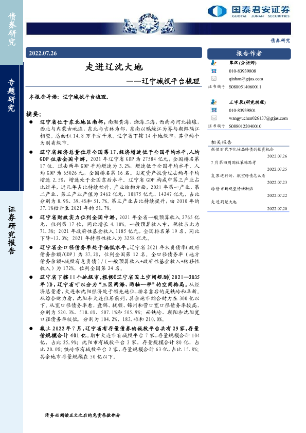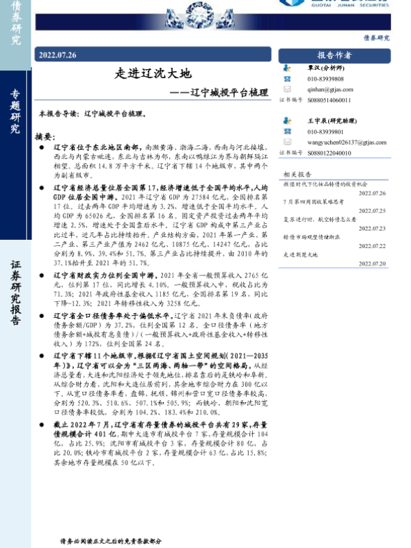 【国泰君安证券】【20220726】辽宁城投平台梳理:走进辽沈大地-15页