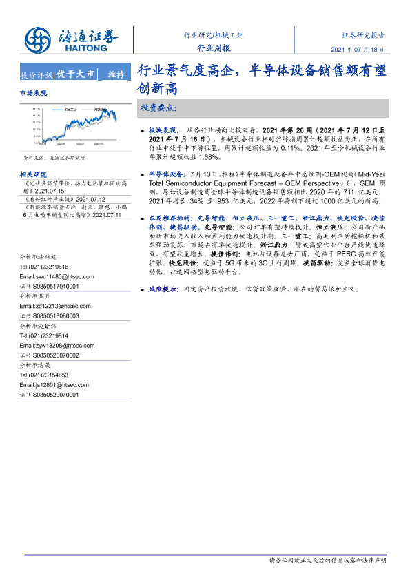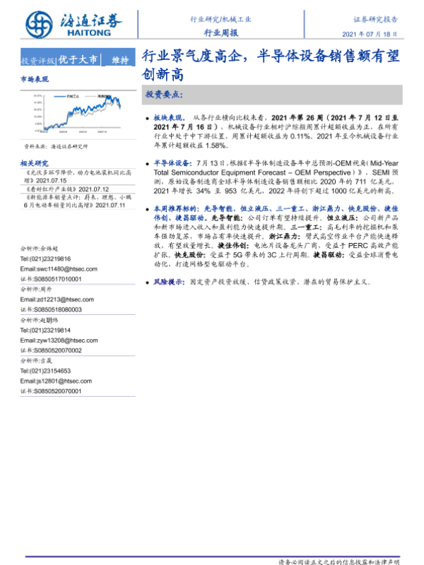 【海通证券】【20210718】机械工业行业周报:行业景气度高企,半导体设备销售额有望创新高-10页