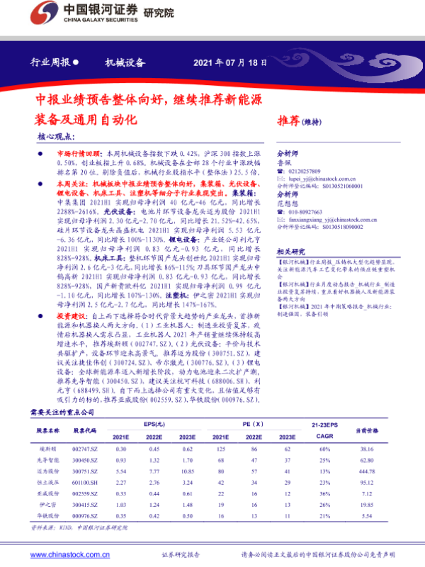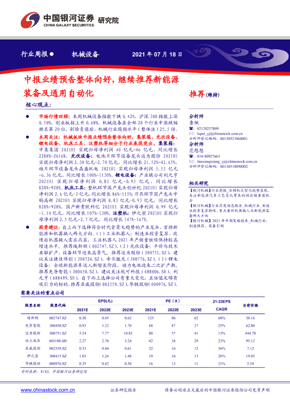 【银河证券】【20210718】20210718-中国银河-机械设备行业周报:中报业绩预告整体向好,继续推荐新能源装备及通用自动化-13页