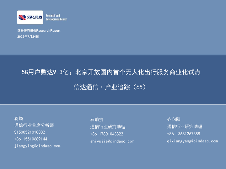 【信达证券】【20220724】通信行业·产业追踪(65):5G用户数达9.3亿;北京开放国内首个无人化出行服务商业化试点-37页