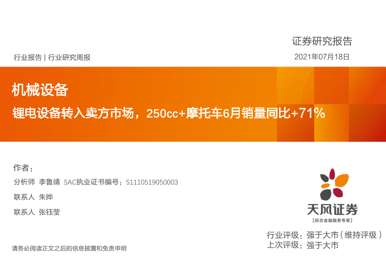 【天风证券】【20210718】机械设备行业:锂电设备转入卖方市场,250cc+摩托车6月销量同比+71%-26页