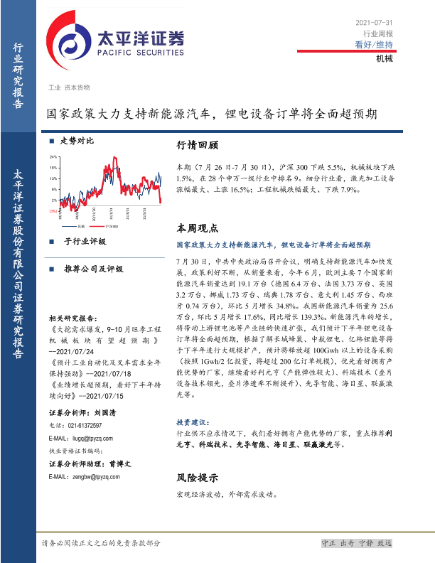 【太平洋证券】【20210731】20210731-太平洋-机械行业周报:国家政策大力支持新能源汽车,锂电设备订单将全面超预期-14页