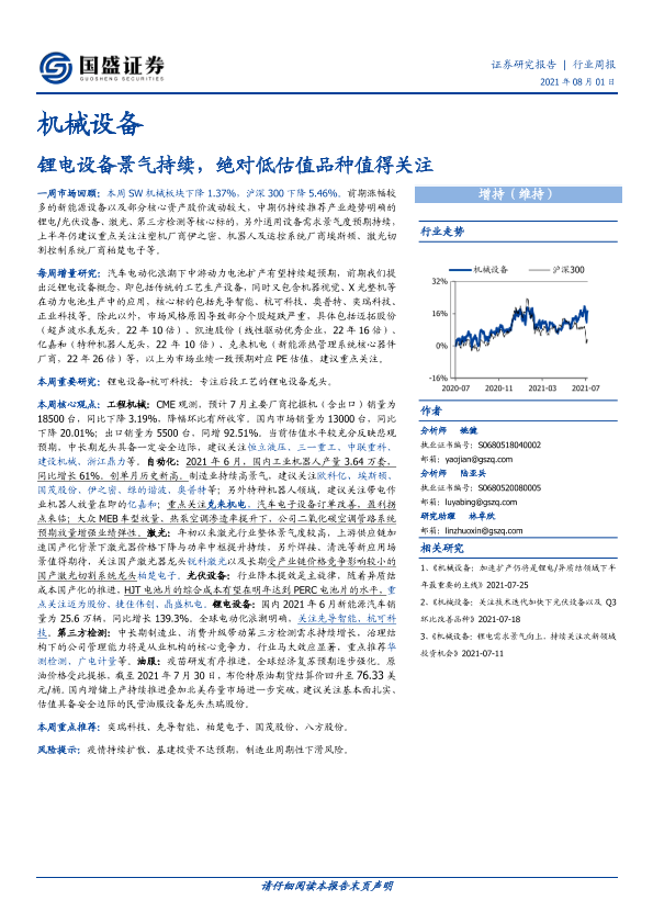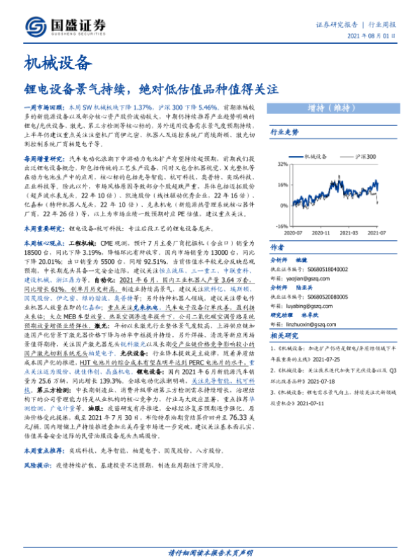 【国盛证券】【20210801】20210801-国盛证券-机械设备行业周报:锂电设备景气持续,绝对低估值品种值得关注-13页