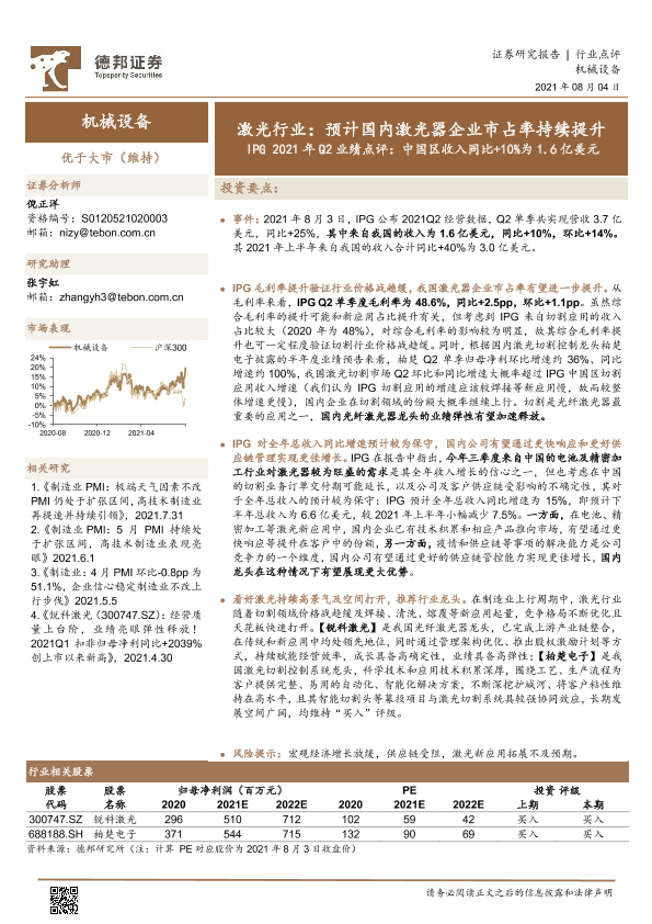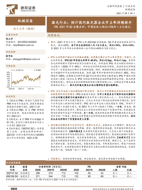 【德邦证券】【20210804】激光行业:预计国内激光器企业市占率持续提升-IPG2021年Q2业绩点评-2页