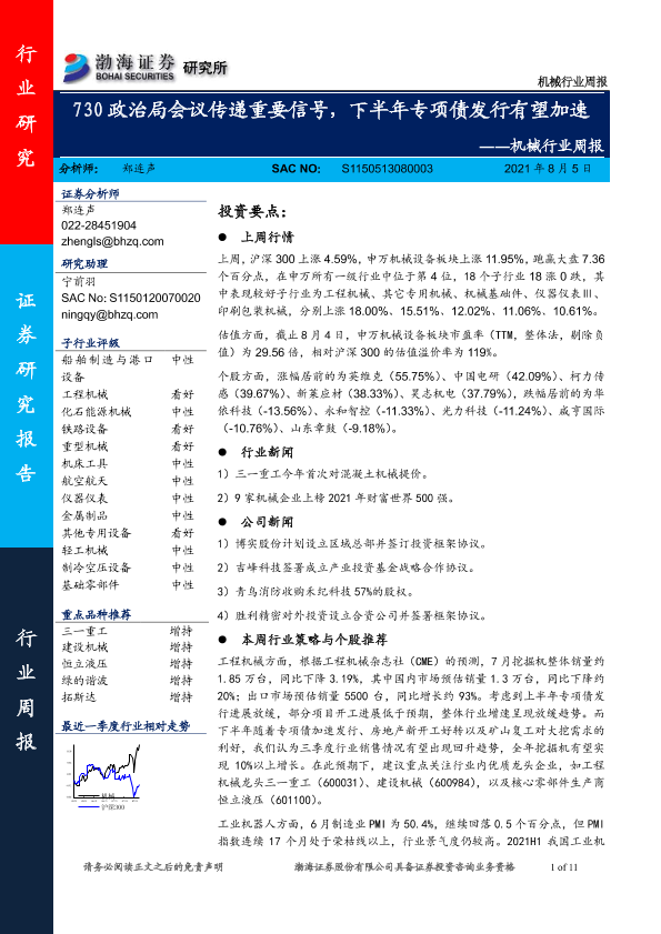 【渤海证券】【20210805】20210805-渤海证券-机械行业周报:730政治局会议传递重要信号,下半年专项债发行有望加速-11页