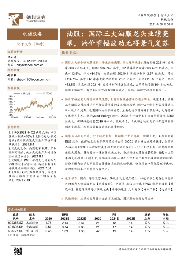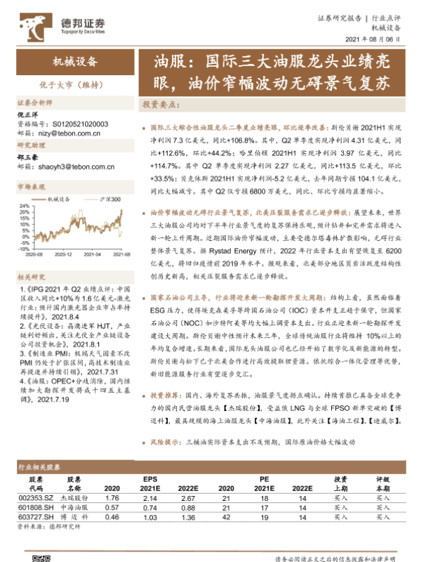 【德邦证券】【20210806】油服:国际三大油服龙头业绩亮眼,油价窄幅波动无碍景气复苏-2页