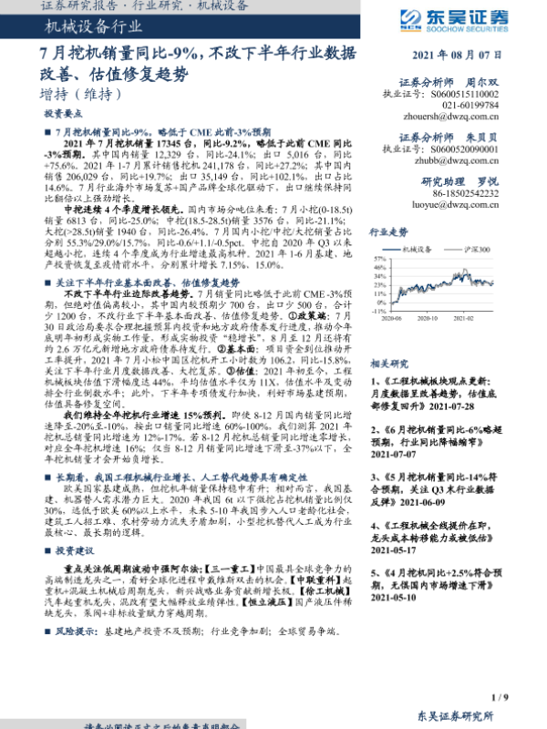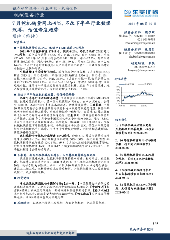 【东吴证券】【20210807】7月挖机销量同比-9%,不改下半年行业数据改善、估值修复趋势-9页